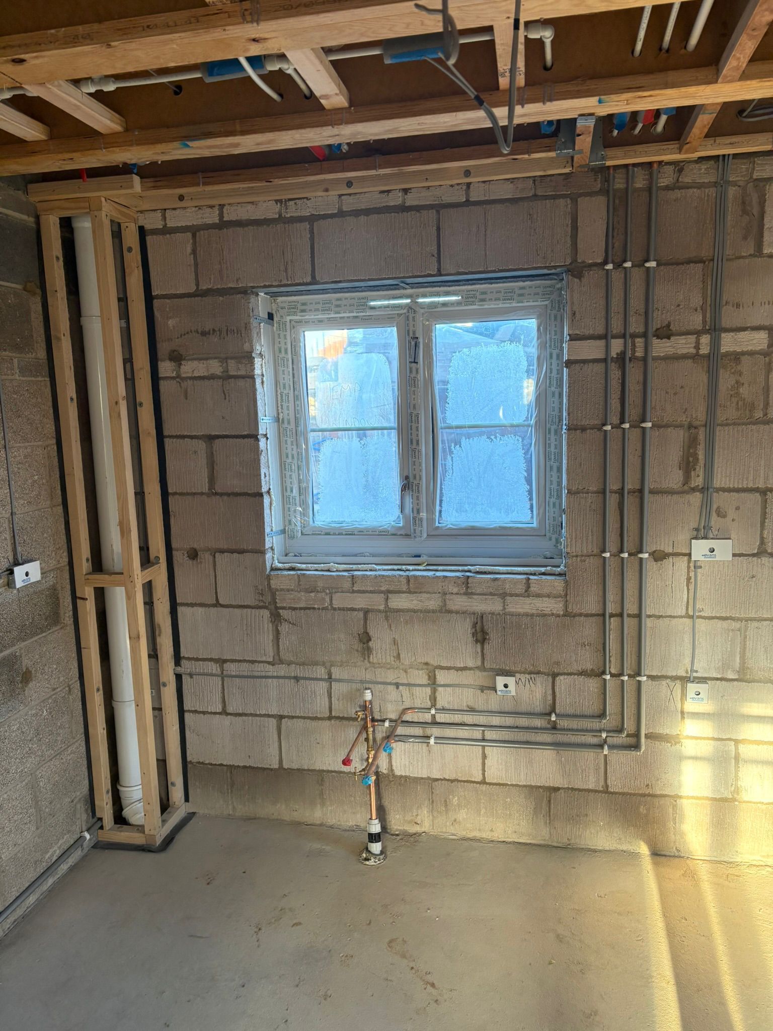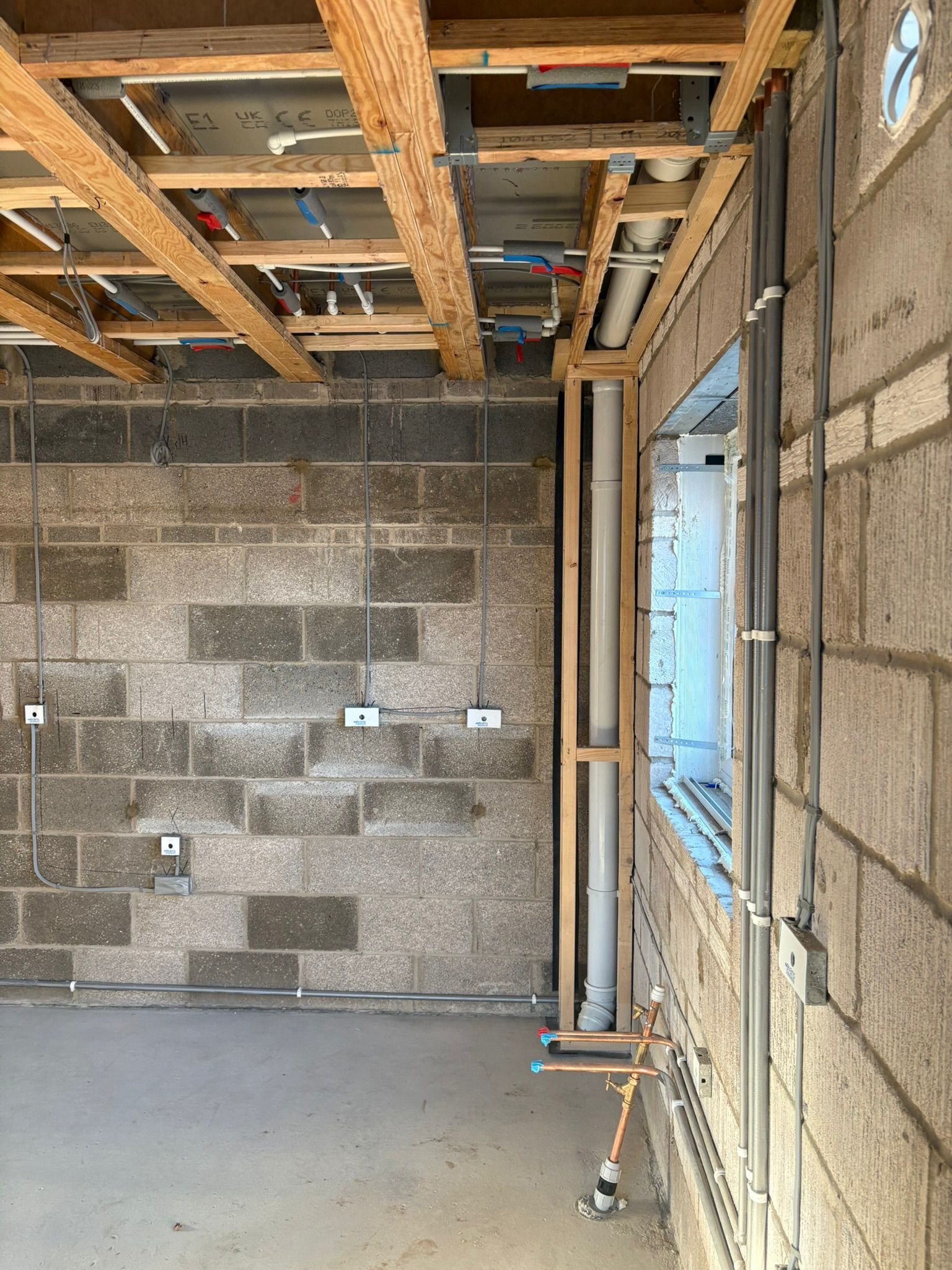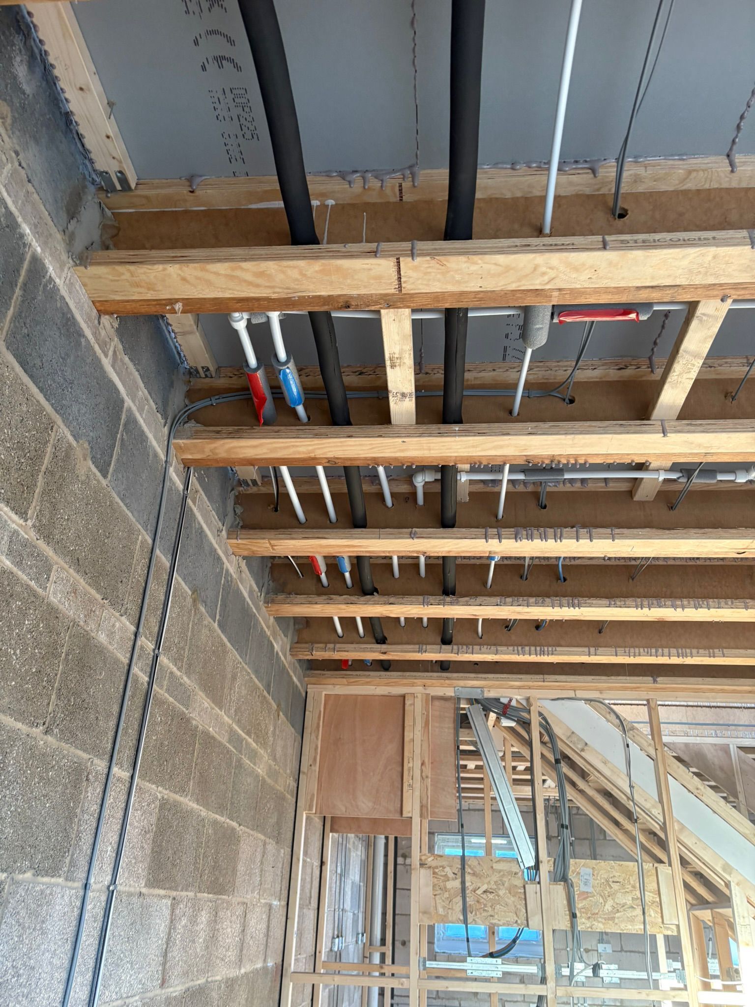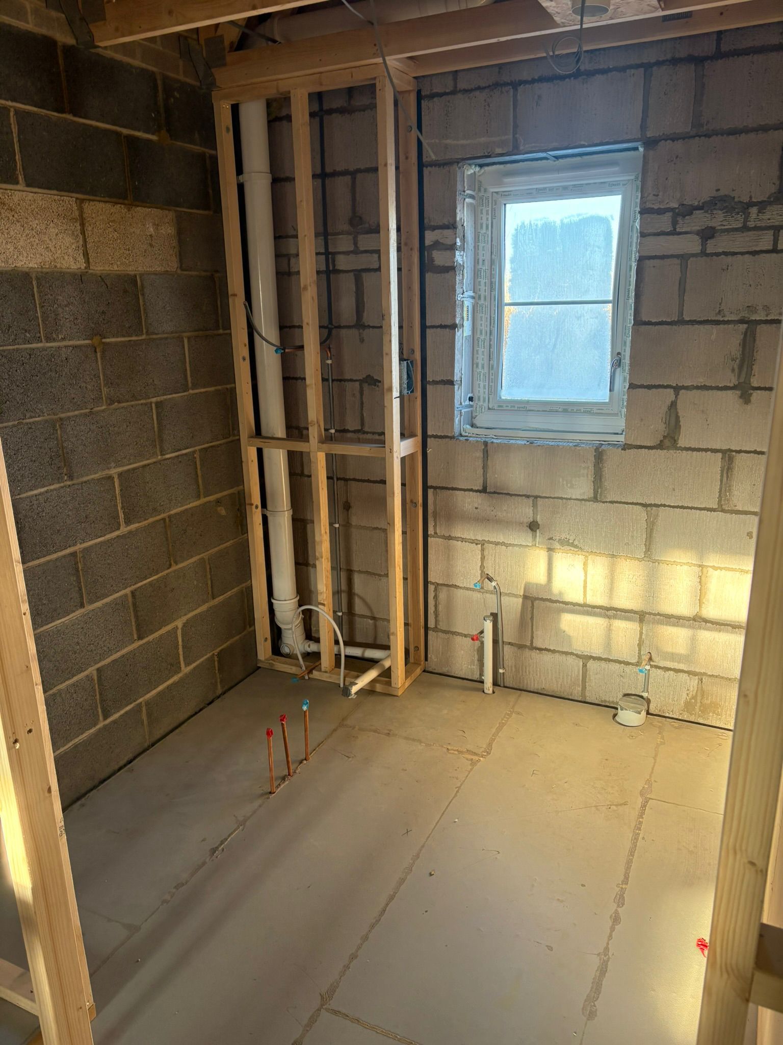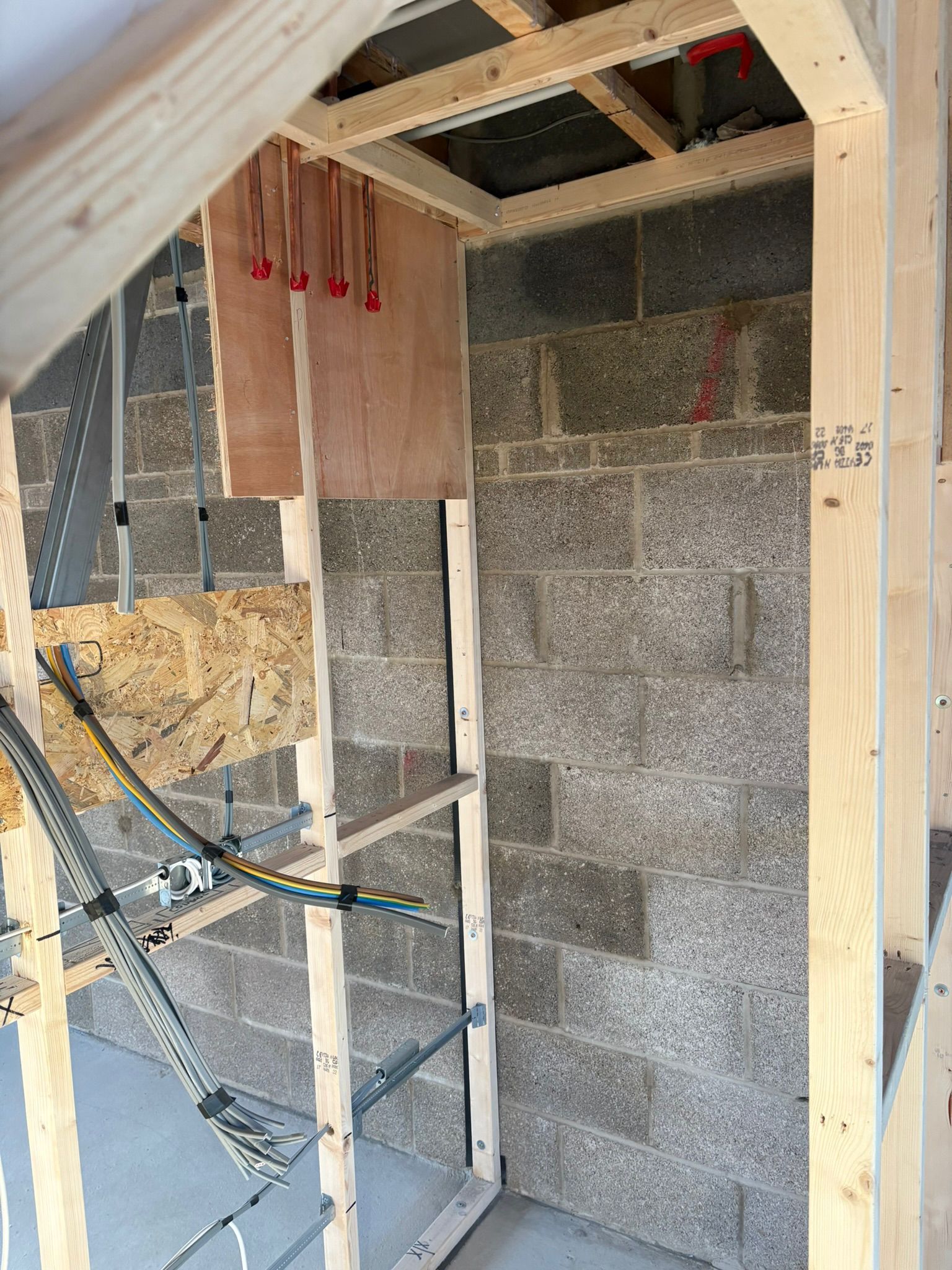 The installation includes full plumbing for both upstairs and downstairs bathrooms, with all pipework, drainage, and services carefully integrated during the build phase to ensure a high-quality finish and compliance with modern building standards.